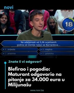 • Ovosedmična epizoda popularnog kviza Tko želi biti milijunaš donijela je gledateljima trenutke napetosti, oduševljenja i iskrenog divljenja, a sve zahvaljujući maturantu Đuri Hameršaku iz Zagreba, koji je svojim znanjem i smirenošću stigao do iznosa od 34.000 eura i osigurao nastavak takmičenja u sljedećoj emisiji. Njegov nastup nije bio samo niz tačnih odgovora, već i priča o hrabrosti, povjerenju i zrelosti koja nadilazi njegove godine.