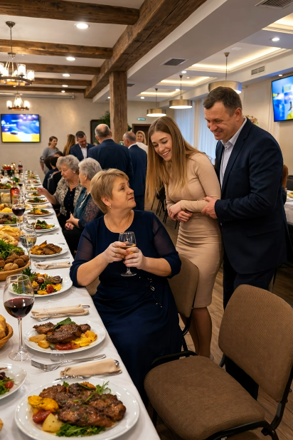 Bivši muž je bio u šoku. Njegova isprika bila je hitra i nespretna: „D-drago… mi je… moramo ići. Oprosti.“ I čim je to izgovorio, zajedno sa svojom zaručnicom napustio je prostoriju, ostavljajući za sobom atmosferu punu zbunjenosti. Svi su na trenutak u tišini gledali za njima dok su izlazili, a kad su vrata zatvorena, glazba je ponovno zaigrala, a gosti su se opustili. Ovaj neobičan trenutak postao je tema razgovora, ali žena nije dopuštala da je to pokoleba.