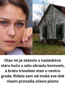 Kada je notar izgovorio da brat nasljeđuje veliki stan u centru grada, njegova postura se još više ispravila. Taj trenutak bio je potvrda onoga u šta je oduvijek vjerovao – da mu pripada više. A onda je došao red na nju. Dobila je staru kuću u zabačenom selu, daleko od gradske vreve i komfora. U tom trenu shvatila je da iznenađenja nema. Oni su znali, prihvatili i čekali. Ona je bila posljednja koja je saznala istinu.