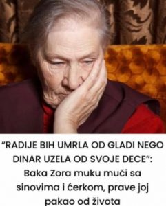 Problemi nisu prestali. Mlađi sin, nakon što je dobio svoj stan, zabranio joj je dolazak zbog jednog komentara koji ga je uvrijedio. Kćerka, svjesna udaljenosti braće od majke, nosila je vlastite teškoće jer nije mogla prihvatiti takvu situaciju. Zora danas živi sama, od skromne mirovine, ali nikada ne bi tražila pomoć od svoje djece. Radije se suočava s teškoćama nego postane teret, a svaki dan moli za njihovo dobro, nadajući se da će pronaći mir i sreću koje ona često nije imala.